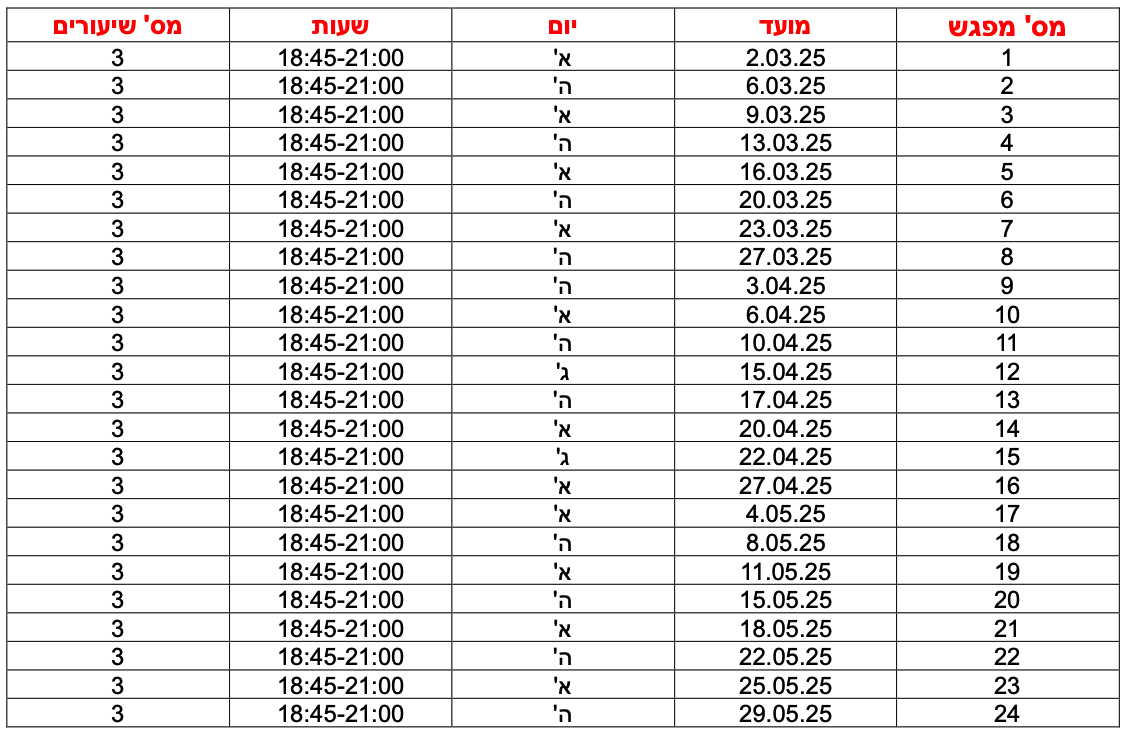 משך הקורס: 3 חודשים (24 שיעורים בחודש).